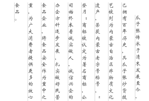 內蒙古瓜子張食品有限責任公司是一家以經營堅果炒貨、食用油加工的生產型食品企業,公司于2010年2月注冊為有限責任公司,坐落在有著8000年紅山文化發源地——赤峰,占地面積13333㎡、建筑面積8000㎡。